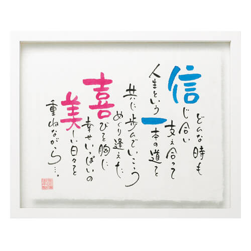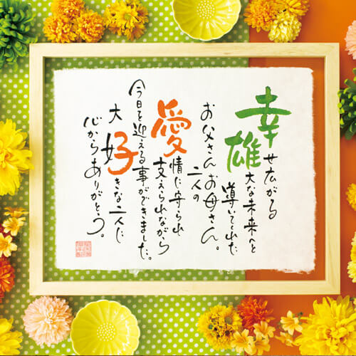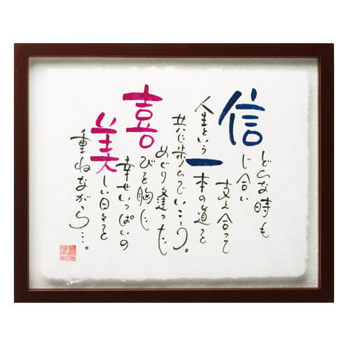 手書きの名入りの詩を大切なあの人に届けるネームインポエムのギフト。夫婦の契り(ちぎり)をちぎり和紙で表現。ウェディングシーンはもちろん結婚記念日やご長寿のお祝い、各種記念日にも人気。和の味わいある風合いを楽しめる逸品。