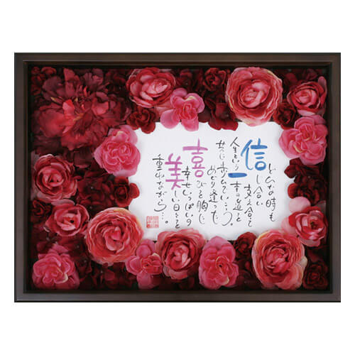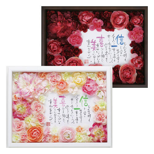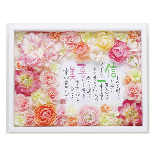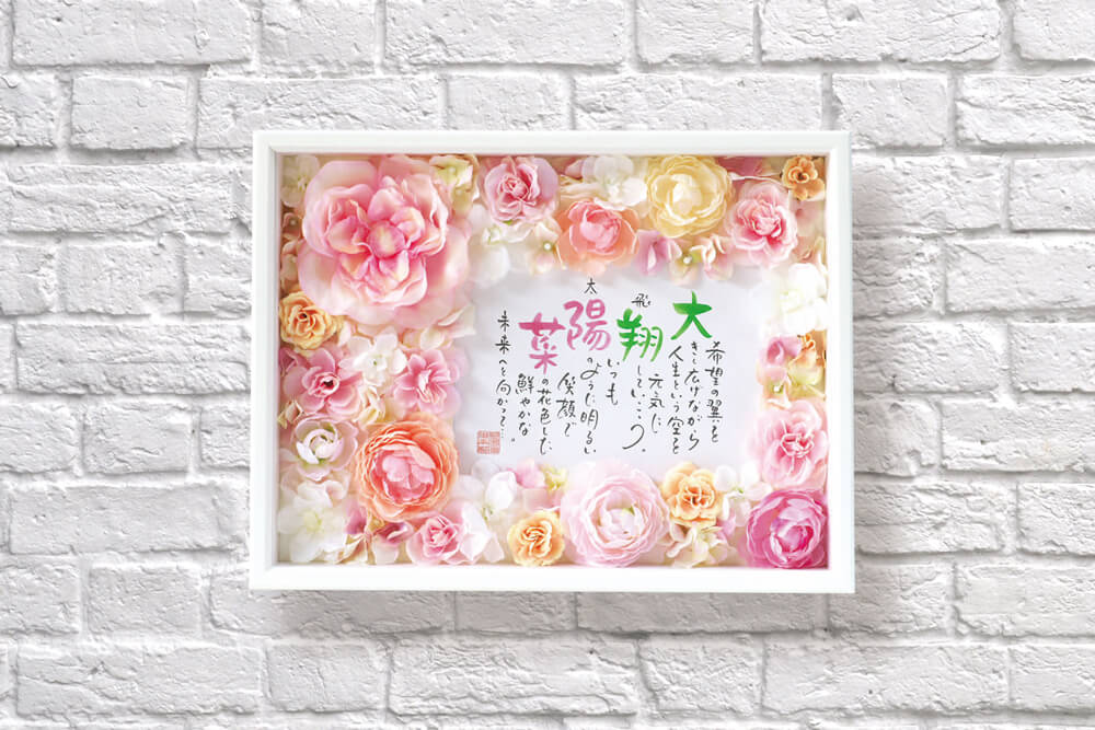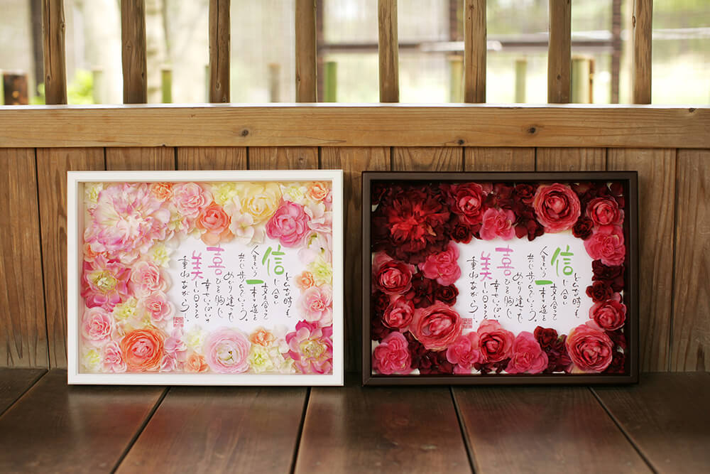 退色しにくいインクとアートフラワーを使用しているので長くお楽しみいただけますが、直筆のため日光や蛍光灯の近くはなるべく避けてください。
