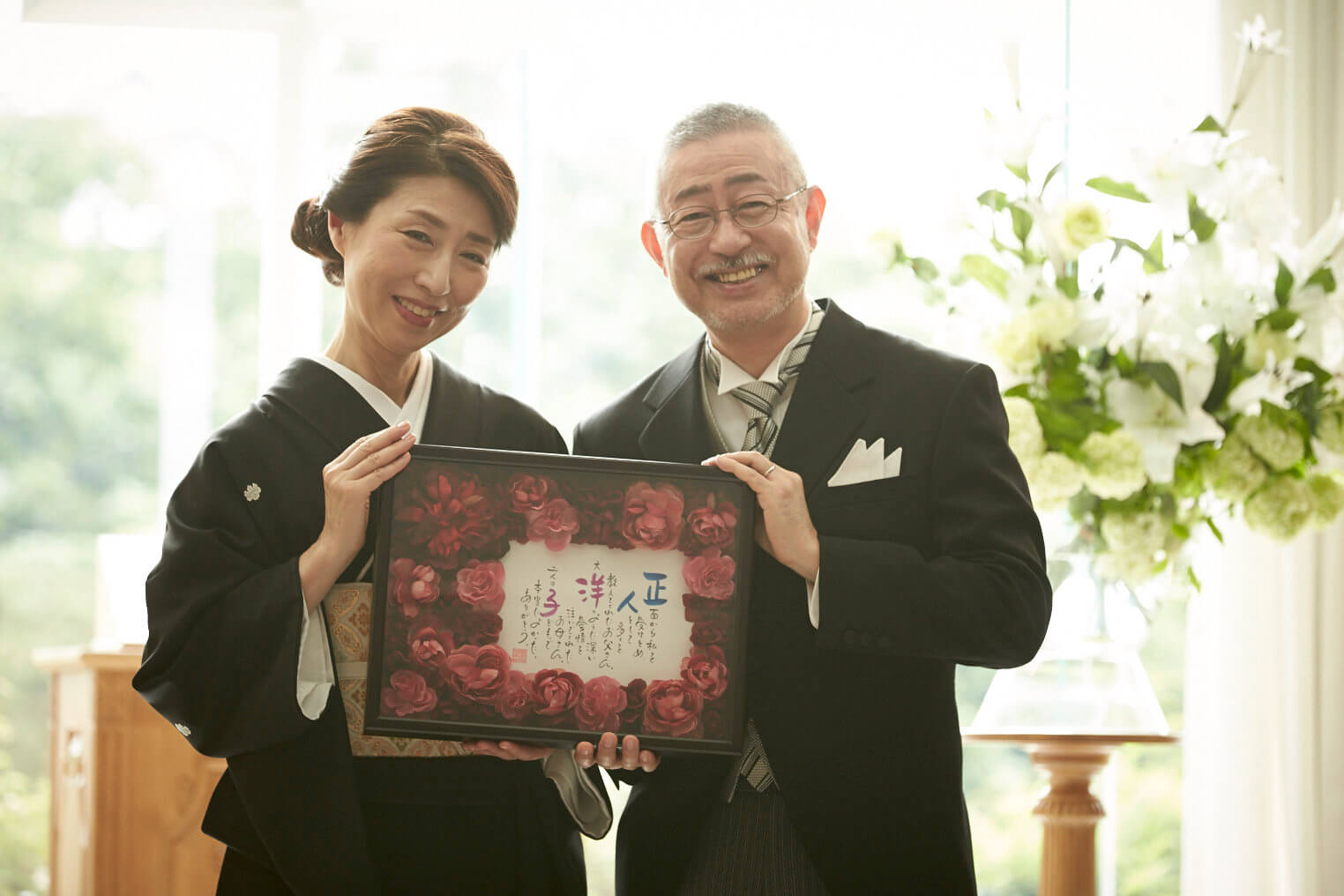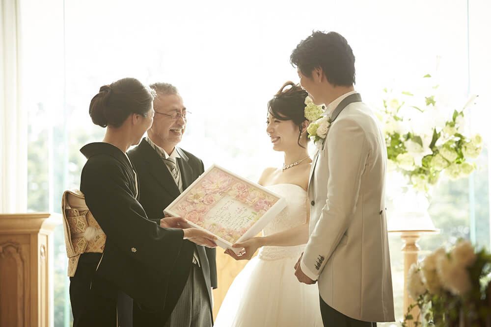 事前に文面を司会者の方へ渡しておき、ご両親への贈呈時に読み上げていただく…