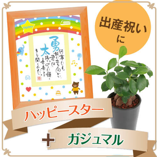 一文字ずつ手書きで思いを込めたお名前入りポエムと、育てやすく可愛らしいガジュマルの木のセットです。