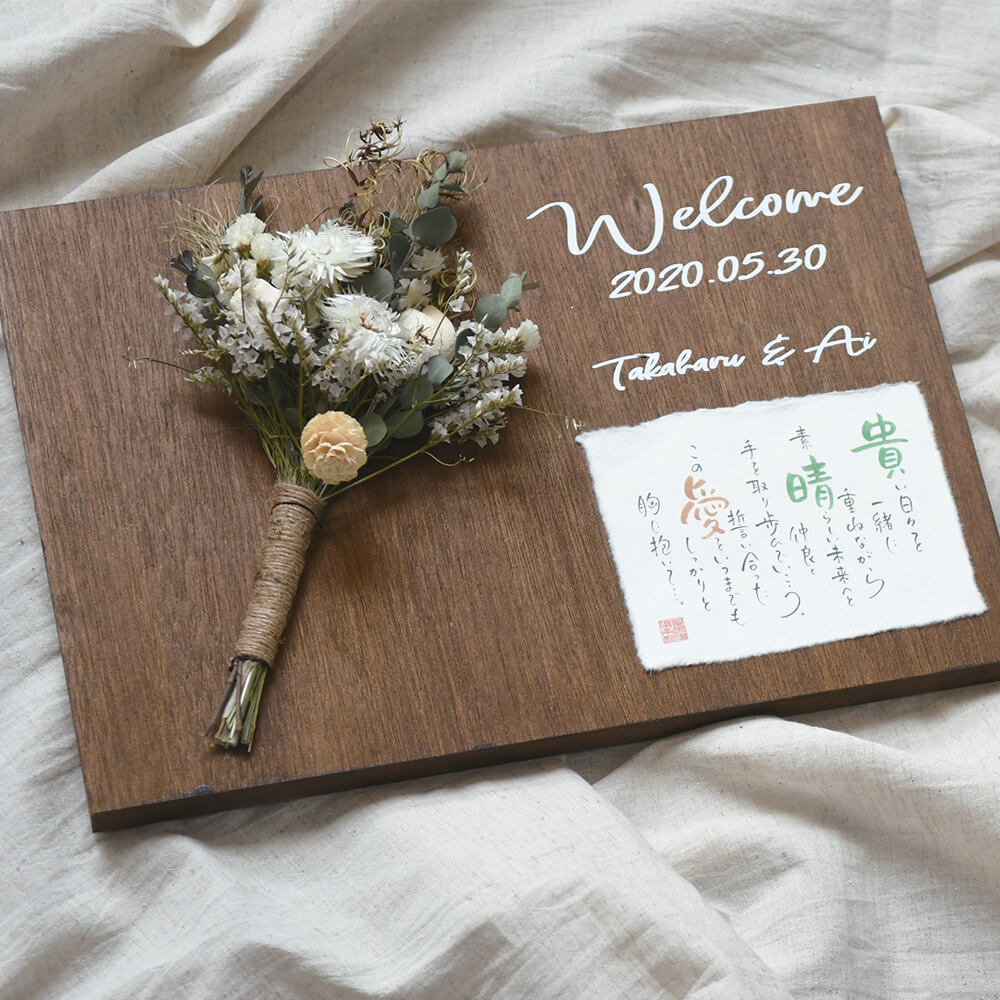 ご両親へありがとうを伝える親贈呈ギフトとして、新たな門出を彩りゲストを迎えるウエルカムボードとして、ブライダルの様々なシーンでお使いいただけます。