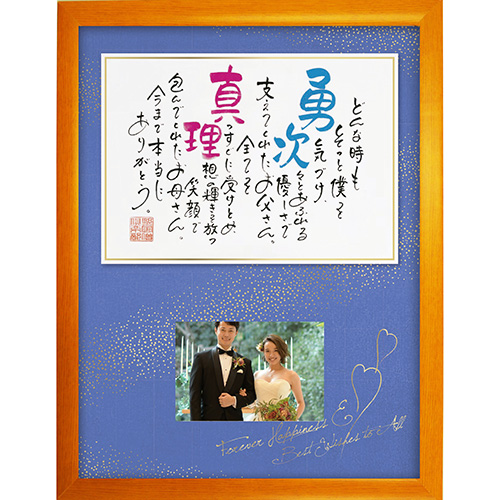 パウダーブルーを基調としたデザインは、まるで煌めく星達が祝福してくれているような爽やかさ。新郎新婦への結婚祝いや、結婚式でのウェルカムボードや親贈呈品、銀婚式や金婚式などの結婚記念日のプレゼントとして人気です。