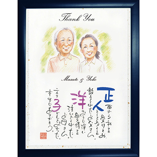 <似顔絵をそえたネームインポエムの2人用似顔絵タイプ>