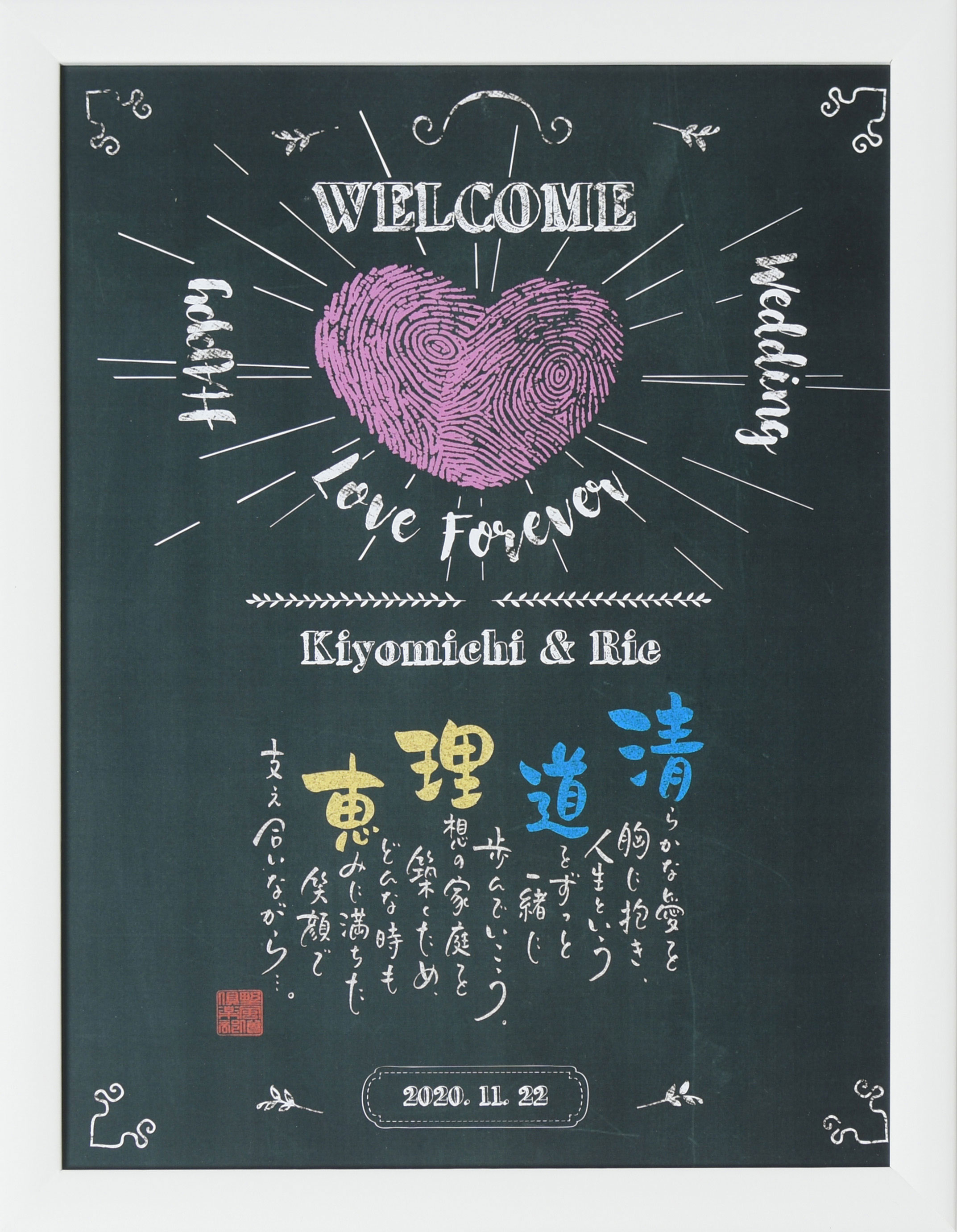 お二人の名前入りの詩に加え、重ねた指紋をハートの形にして二人の愛を表現。世界に一つだけの品で、大切なウェディングシーンを彩ります。