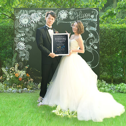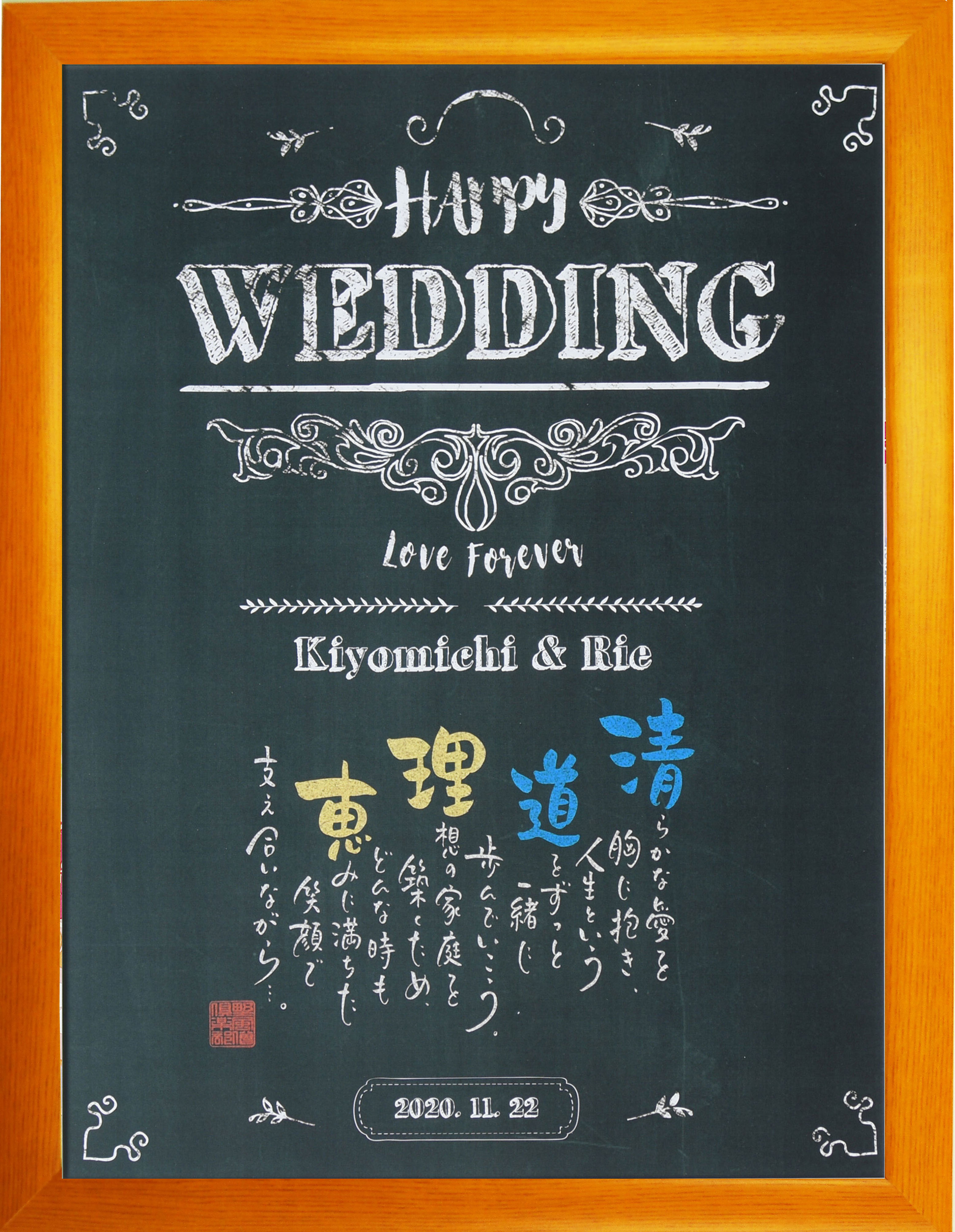 お二人の名前入りの詩をチョークアートで彩った世界に一つだけの品で、大切なウェディングシーンを演出します。