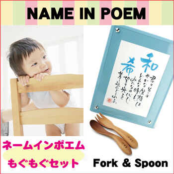 名前入りの詩が評判のネームインポエムの1人用カラーボードフレームと安心して使える天然素材のスプーン&フォークのセット商品。