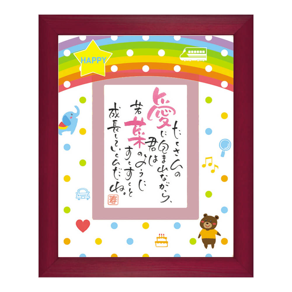 ガジュマルの樹の根本には「キジムナー」という幸福を呼ぶ妖精が住むと言われています。これから生まれてくるお子様の幸福を祈る贈り物としていかがでしょうか。大きな虹が架かり、クマさんやゾウさんや乗り物たちが描かれた、子ども向けの可愛いデザインのポエムとのセットなので一緒に寝室に飾ってもいいかも。