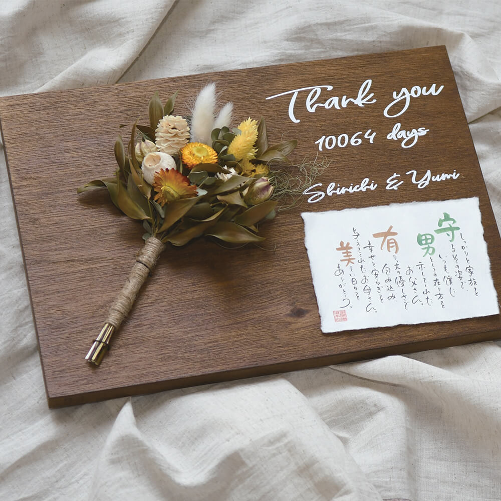 ご両親へありがとうを伝える親贈呈ギフトとして、新たな門出を彩りゲストを迎えるウエルカムボードとして、ブライダルの様々なシーンでお使いいただけます。