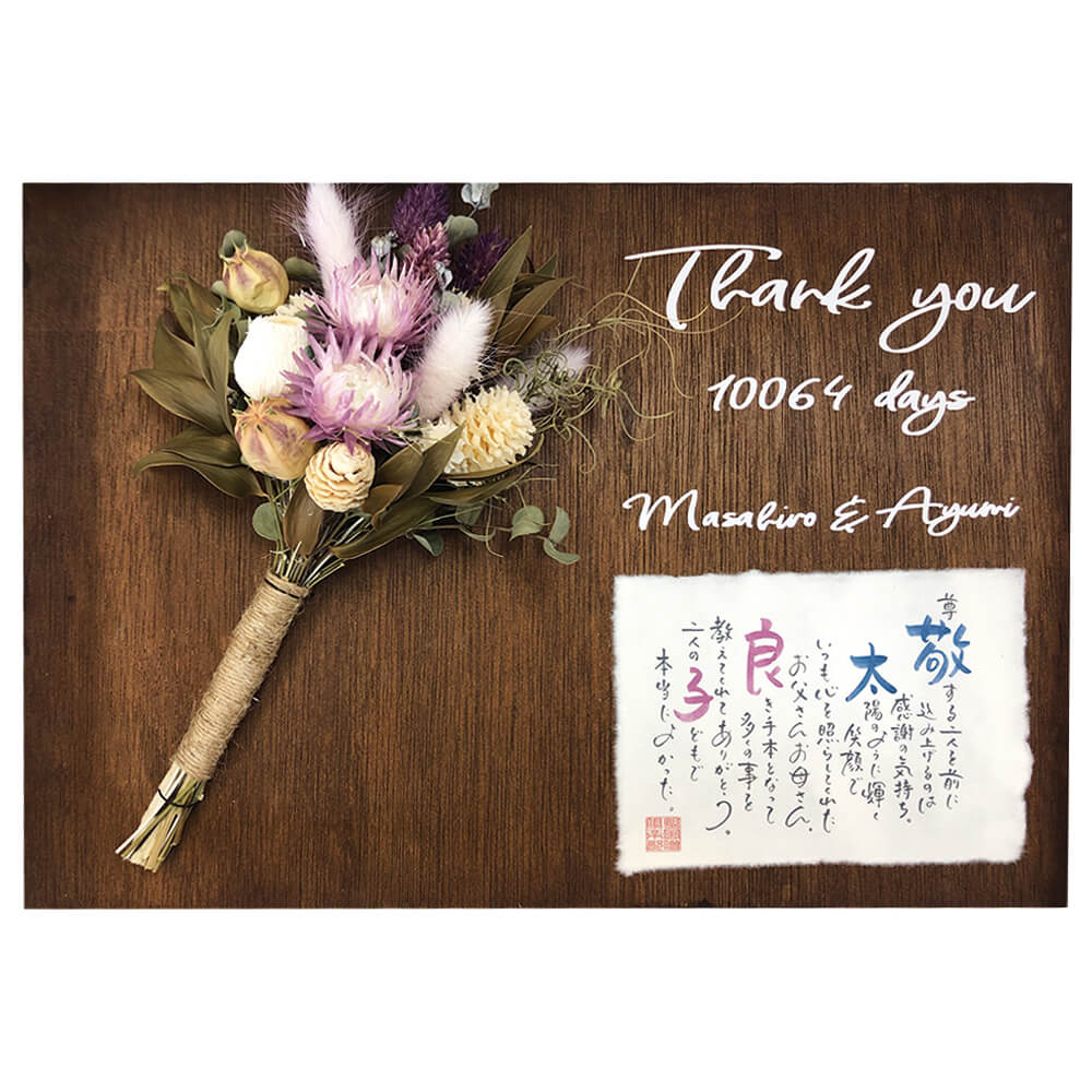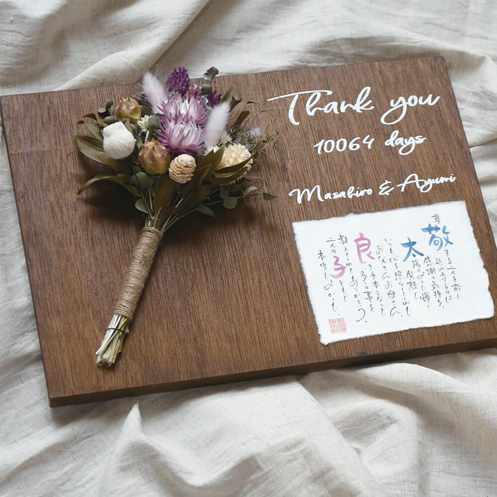 ご両親へありがとうを伝える親贈呈ギフトとして、新たな門出を彩りゲストを迎えるウエルカムボードとして、ブライダルの様々なシーンでお使いいただけます。