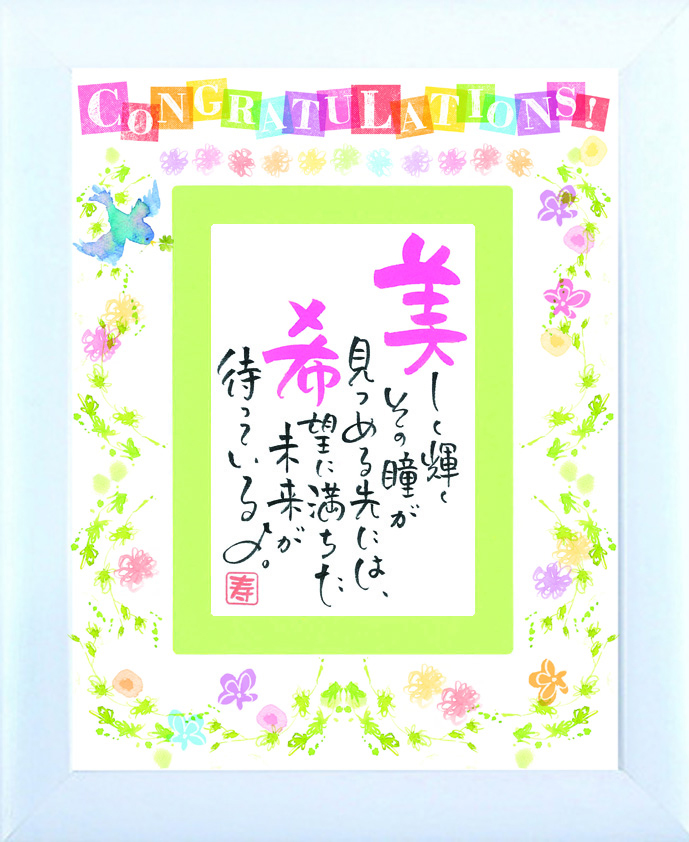 “CONGRATULATIONS!”(おめでとう!)のメッセージに舞う幸せの青い鳥。水彩画タッチのイラストがポエムに優しい彩りを添えてくれます。