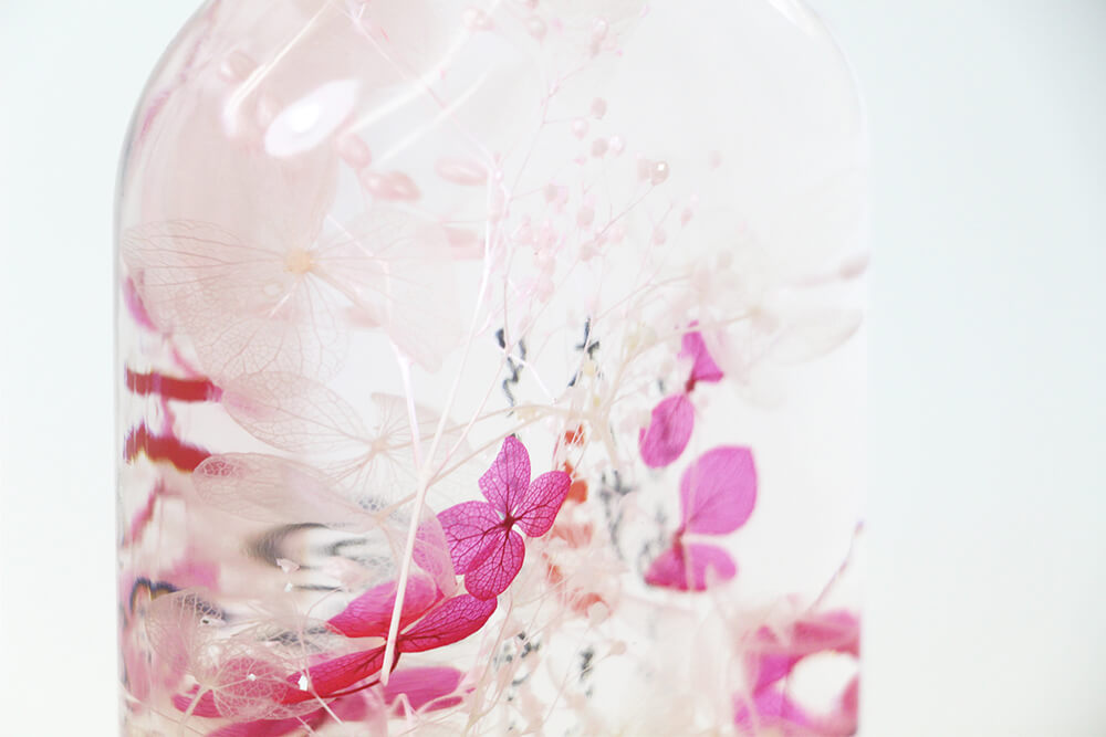 「ハーバリウム」とは植物標本のこと。 シンプルなガラスボトルの中に、ドライフラワーやプリザーブドフラワーを 専用の保存液で閉じ込めることで、 生花より長く(約1年間)お花を鑑賞できる、 今大人気の新感覚インテリア雑貨です。