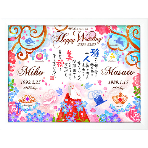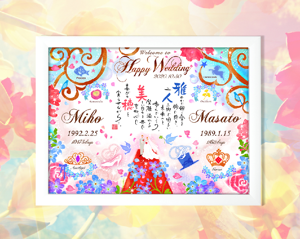 お二人の名前を入れたポエムに誕生石や挙式日、ご生誕から結婚までの日数などを入れたイラストを添え、世界に一つだけの幸せな記録を彩る華やかなデザインです。