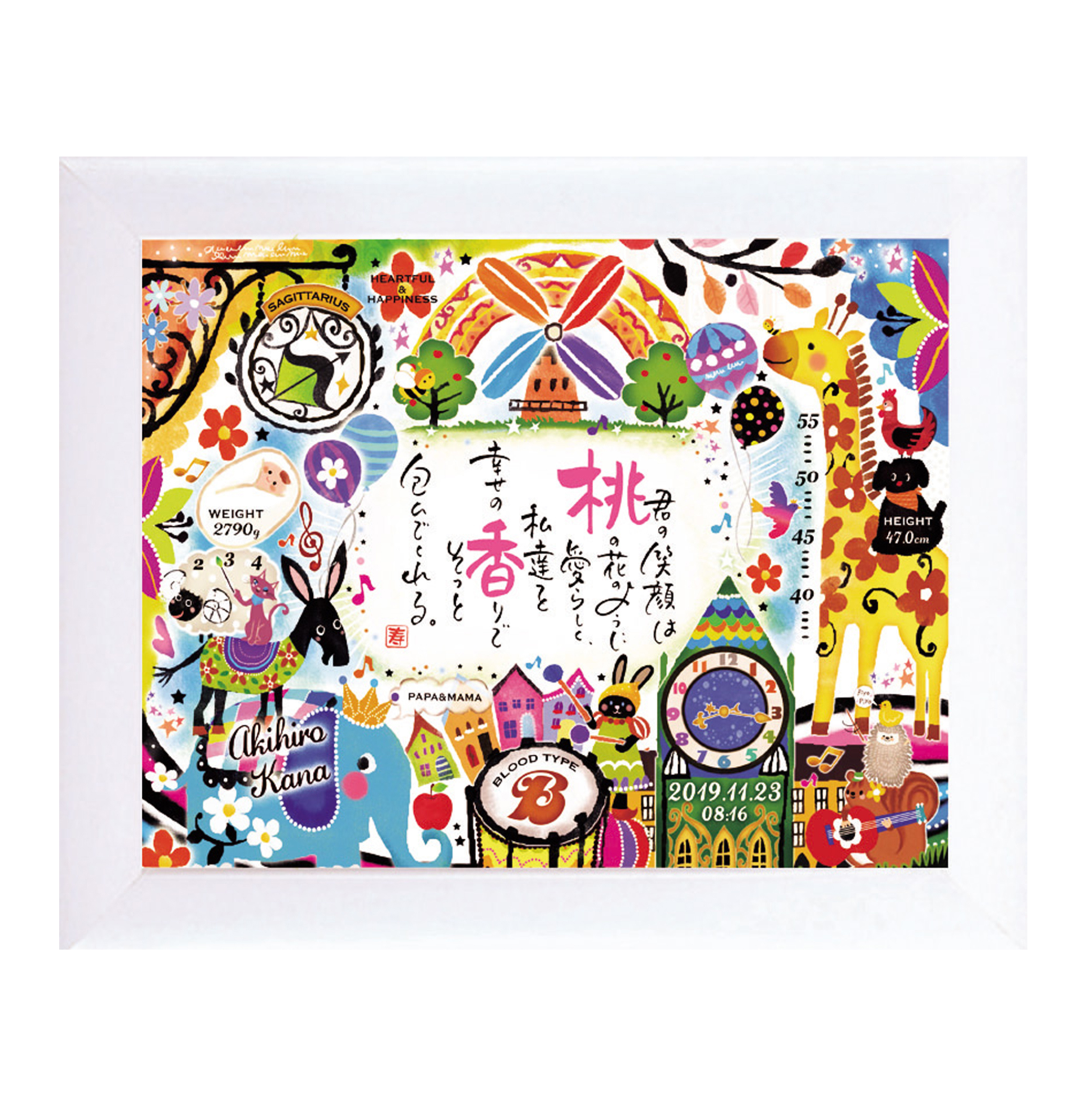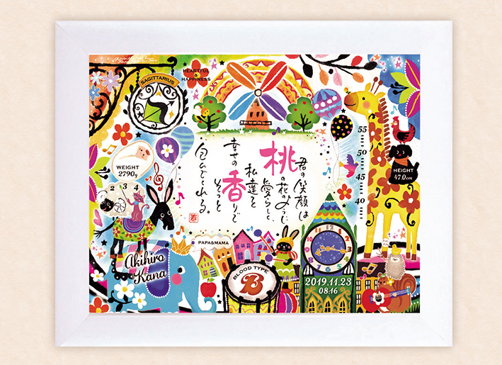 (赤ちゃんのお名前、出生日・出生時間、パパ・ママのお名前、星座、出生身長、出生体重、血液型OR誕生花)