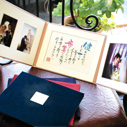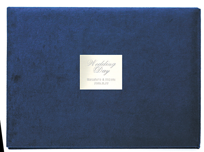 名前入りの詩と写真を添えたネームインポエムのアルバムタイプの3ツ折りシリーズ。高級感漂うスエード素材で、表紙には名前と日付を刻印したアルミプレート付き。皆様の思い出を彩ります。
